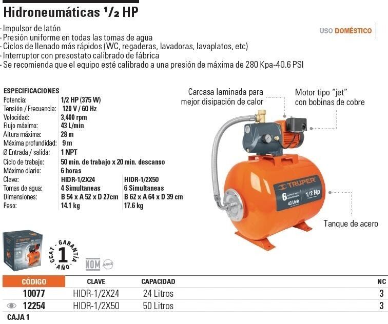 Bomba Hidroneumática 1/2hp 50 Litros Domestica Truper 12254